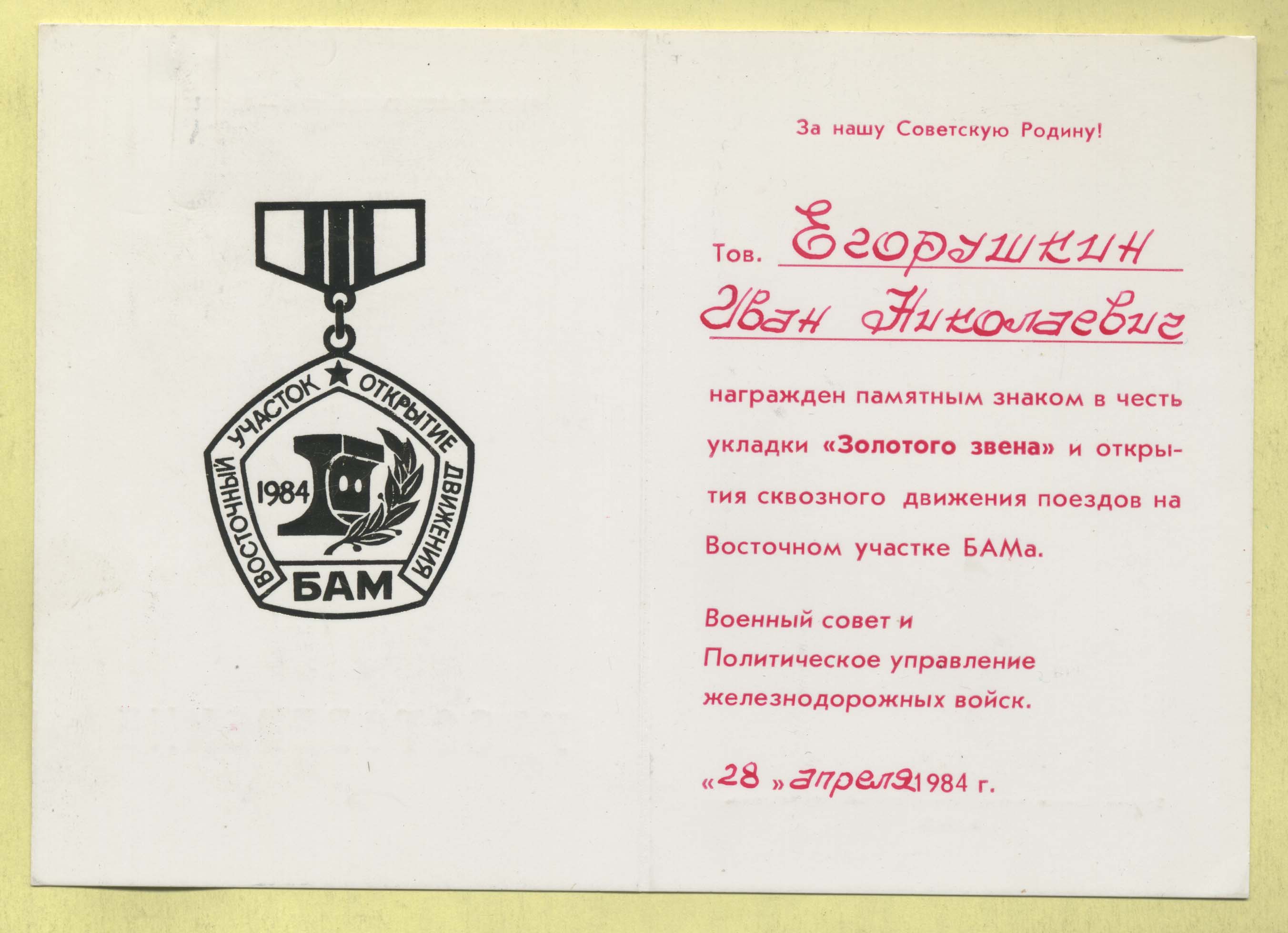 Удостоверение на памятный знак в честь укладки "Золотого звена"