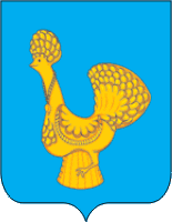 Описание герба «В лазоревом поле золотая игрушка в виде курицы с ожерельем на шее, сидящей на опрокинутой корзине».